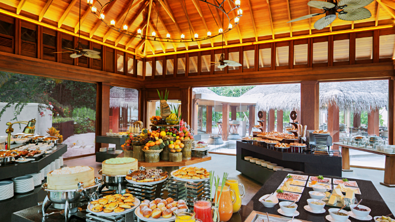 아침식사는 올인클르시브 요금이나 아침식사만 포함해서 예약을 한다. 아침식사는 대부분 포함으로 숙박 예약을 한다. 아침식사는 늘 즐거운 경험이다. 직접 만들어서 먹는 음식이 아니고 다른 누군가가 차려준 음식을 먹는다는 기대감에 행복하다. 바게트, 도넛, 호밀빵, 팬케이크 등 각종 빵과 버섯, 토마토, 양배추, 아보카도 등의 야채와 시리얼, 즉석에서 만들어주는 오믈렛, 스크램블, 국수 등 다양한 라이브 세션과 각종 인터내셔널 음식이 나를 기쁘게 만들어준다. 단순히 아침식사 뷔페만 있는 게 아니라 내가 묵고 있는 객실이나 빌라로 가져다주는 인빌라 아침식사, 나의 객실에 개인 풀장이 있다면 풀장 위에 아침식사를 띄워놓고 먹는 플로팅 아침식사 등을 먹을 수 있다. 투숙 시간에 따라 매일 제공해주는 곳, 1회 제공해주는 리조트도 있고 유료로 제공하는 곳도 있다. 대부분의 특급 리조트는 식사의 퀄리티가 좋아서 한국에서부터 별도의 먹을거리를 가져가지 않아도 된다. 간혹 리조트에서 김치가 제공되는 곳도 있다.